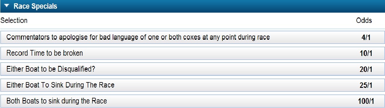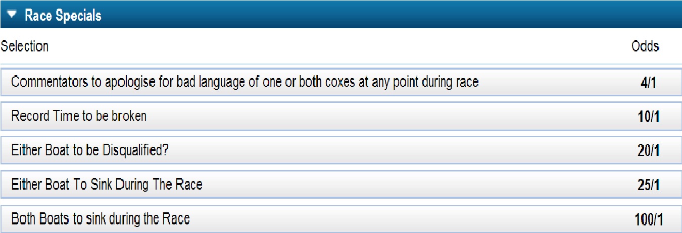 Oxford are the bookies and most experts favourite as many feel that their experience will prove superior over the weight advantage of Cambridge but I wouldn’t count them out completely. As well as just betting for a winner there are also some more interesting bets to be placed. My personal favourite is ‘Commentators to apologise for bad language of one or both coxes at any point during the race’. Hint this is almost guaranteed. Another favourite is for either boat to sink. You may think this impossible but it is not uncommon and a quick YouTube search will show you it does happen. As anyone will know, if the wind picks up then the Thames can become a rough patch of water and there has been many a rowing boat to go down.